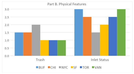Across the studied cities there were significant differences in maintenance status and aesthetic ratings for the various bioswales that were being studied. In general participants rated the bioswales to be in an aesthetically pleasing status (Figure 6). With San Francisco and Chicago having lower ratings than the other cities. In Chicago, New York, San Francisco, and Toronto the inlets to the basins were observed to be partially or fully blocked for some basins implying an impact of maintenance on the design function of these bioswales (Figure 6). Plants were generally regarded as healthy across all cities except Chicago (Figure 6). Buffalo and Chicago were both sites with well-trimmed plants while San Francisco has completely untrimmed plants. The other cities had some locations with trimmed and some with untrimmed plants (Figure 6). Similarly, the cities diverged when it came with respect to trash with New York bioswales beset by observable trash while San Francisco, Toronto, and Vancouver had no trash with Chicago and Buffalo falling into a mixed category with respect to the presence of trash (Figure 6).