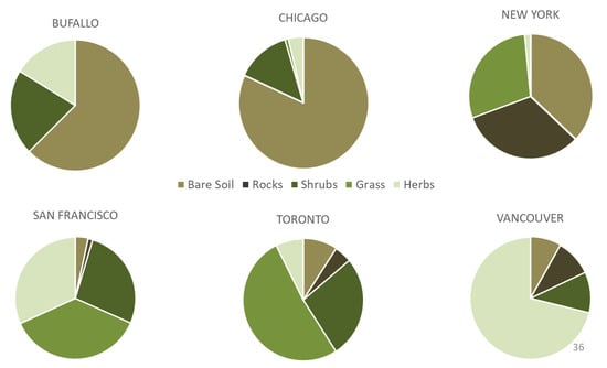 The cities had observable differences in vegetative cover (Figure 7). The observed Chicago basins had a large amount of bare ground as did basins in Buffalo. New York also had a notable amount of bare ground along with rocks presumably placed as surface mulch. The other three cities had robust ground coverage but different mixes of plants. In Toronto grasses and shrubs dominated bioswale ground cover. In Vancouver herb coverage dominated the surface of bioswales. Finally, San Francisco basins were roughly equally covered by shrubs, grasses, and herbs.