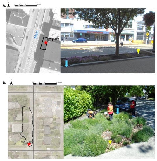 Aerial Images and photos of A. Buffalo, NY (A) and B. Vancouver, BC (B) bioswales where BUF-Y and VAN-X, respectively, sensor data was collected. Aerial images to the left of each photo, provided to citizen scientists with their GIRA protocol packets, show an outline of estimated drainage area for each bioswale with location of bioswale depicted by red star. Photos to the right of aerial images depict the approximate location of bioswale inlets (blue arrows) and areas where the sensor GIBox were installed (yellow triangles).