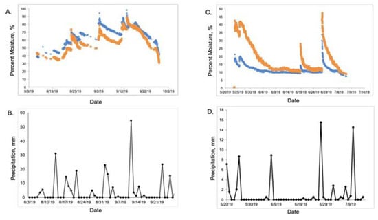 GIBox soil moisture sensor and local local meteorological agency precipitation data for the Buffalo, NY bioswale (BUF-Y; A,B) and the Vancouver, BCbioswale (VAN-X; C,D). Soil moisture data is recorded as percent moisture for sensors located at 10 cm (blue) and 20 cm (orange) below the soil surface. Precipitation data (black) is recorded in millimeters. The VAN-X (C) GIBox 10 cm and 20 cm moisture sensors were inadvertently switched when installed by the citizen scientists.