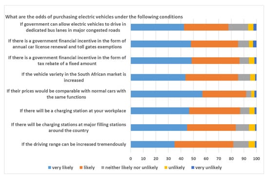 Since the driving range of EVs is one of the major thorns in their adoption all over the world [30], respondents are willing (over 80%) to make future purchases of EVs if this problem is solved (Figure 1). The chi-square results showed a significant difference in responses by gender (at 5%), with a considerable percentage of females not eager (7% female vs. 3% male) to purchase EVs even if the driving range is increased (Table 1). In order to fulfil this promise, there has to be major breakthroughs in the development of rechargeable batteries [31]. There are signs of success in this area, as some of the new cars on the market in Europe and North America are proclaimed to have a driving range exceeding 500 km [31]. Based on this information, consumers will have less range anxiety in the future and the number of electric vehicles on South African roads will definitely increase.