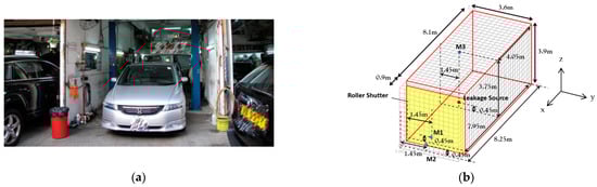 An example garage of size 8.1 m (x-direction) × 3.6 m (y-direction) × 3.9 m (z-direction) as shown in Figure 2a is used in the simulation. A roller shutter is provided at x = 8.1 m with a height of 3.6 m from ground level. The rolling shutter is assumed to be able to withstand a pressure of 0.2 bar.