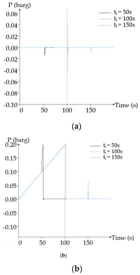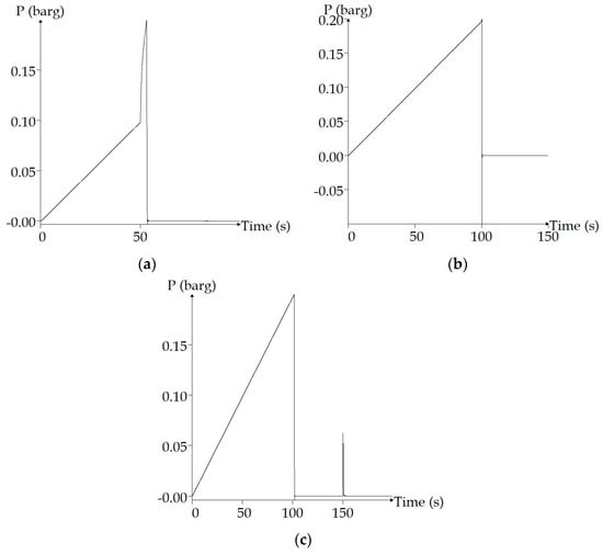 Pressure explosion comes from the building up of pressure during combustion. For monitoring point M1, i.e., near the roller shutter in the garage, the variations of pressure in the above three scenarios are as shown in Figure 3a–c.