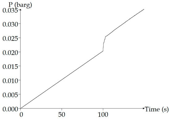 In simulation C2, alike to Simulation C1, pressure is built up constantly inside of the garage due to the leakage of LPG before the ignition. A jump of pressure is observed during the ignition at t = 100 s, followed by a drop in pressure due to the opening of the roller shutter at 0.2 barg.