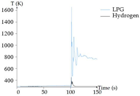 Although the ignition time is at t = 100 s for simulation C2 for LPG taxis and H2 for hydrogen taxis, the surge in temperature at M3 near the ceiling above the point of ignition is found to be much greater in case of LPG leak in C2 (Figure 12).
