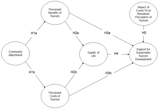 Additionally, Hateftabar and Chapuis [1] revealed insignificant associations between residents’ attachment to a particular place and their views on tourism impacts (positive and negative). Similarly, Stylidis [17] concluded that place attachment did not have a substantial impact on residents’ evaluation of tourism impacts. Despite the contradictory findings of previous studies, we propose the following hypotheses that are meant to provide additional empirical evidence and address these inconsistent results: