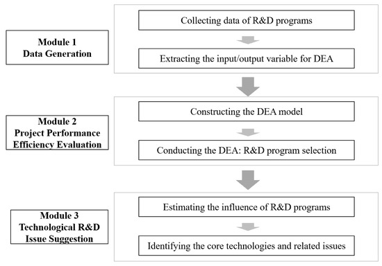To maximize the efficiency of R&D investment, it is necessary to invest a large budget in areas that have the potential to yield a high ROI (return on investment). In addition, it is also needed to boost investment efficiency while minimizing inefficiency by following systematic budgeting [5]. Here, the analysis was carried out using a data envelopment analysis method. The DEA (data envelopment analysis) approach, which can clearly define the efficiency, was selected as an analysis method to select several excellent programs. DEA has DMUs (decision-making units) with multiple inputs and multiple outputs. This model is a non-parametric approach to selecting DMUs with a maximal efficiency that does not require several criteria in advance. For this reason, it is used when several variables with clear inputs and outputs need to be analyzed at the same time, and it is a method that is widely utilized for efficiency analysis for public R&D programs. In other words, ways to allocate budgets proactively to areas that are likely to maximize performance in the future should be identified, and strategies that ensure greater output relative to budget inputs should be devised [6]. However, existing research has only performed DEA at the level of government-funded research institutes. As a result, it was difficult to know which national R&D programs offered more efficiency [7].