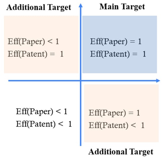 Our portfolio analysis, which was illustrated in Figure 2, was based on a performance efficiency analysis in terms of patents and papers for R&D programs. Each R&D program was allocated the quadrant by calculating paper efficiency and patent efficiency. For the programs placed on the right side of the y-axis, their paper efficiency was max (1). Similarly, for the programs placed above the x-axis, their patent efficiency is 1. Therefore, for the program assigned to Quadrant I, both the patent and patent efficiencies of the R&D program were 1. As for the program placed in Quadrant III, both the paper and patent efficiencies of the R&D program were less than 1 [32]. In this study, the program with max paper (patent) efficiency could be assumed that they have the superior performance of papers (patents) compared to the inputs of budget and workforce. Therefore, an analysis of the potential performance of the R&D programs in Quadrant 1 was performed. Those programs in Quadrants II and IV were also selected and analyzed if meaningful implications are anticipated [33].