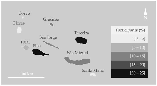 The nine islands of the Azores. Distribution of the 1528 participants in each island. The islands’ positions are not proportional to their real geographic location; scale applies only to the islands’ size.