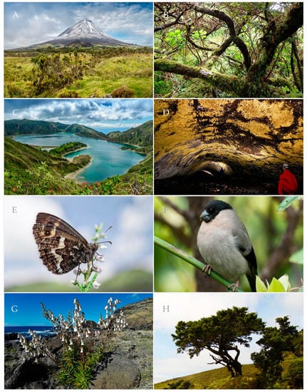 Due to their rich biodiversity, the Azores and all the other Macaronesian archipelagos are included in the Mediterranean Hotspot of Biodiversity []. In fact, there are more than 400 Azorean endemic species, and many single-island endemics, including arthropods (266 taxa), mollusks (49 taxa), chordates (especially birds and bats [12 + 1 taxa]), and vascular plants and bryophytes (73 + 7 taxa) []. Besides this impressive number of unique species, the Azores also harbors important areas of diversity, which form the core of the nine terrestrial Natural Parks and the Marine Natural Park of the Azores. Figure 2 illustrates the regional context wherein the pupils are brought up, with four of the most paradigmatic natural areas (volcanic mountains, laurissilva forests, lagoons and lava tubes) and four endemic species of the Azores (butterfly, bullfinch, bellflower, juniper).