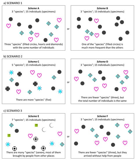 Graphical representation of the three scenarios conveying different biodiversity conservation dilemmas regarding: (a) species evenness vs. dominance—Scenario 1; (b) species richness vs. abundance—Scenario 2; and (c) exotic vs. native species—Scenario 3.