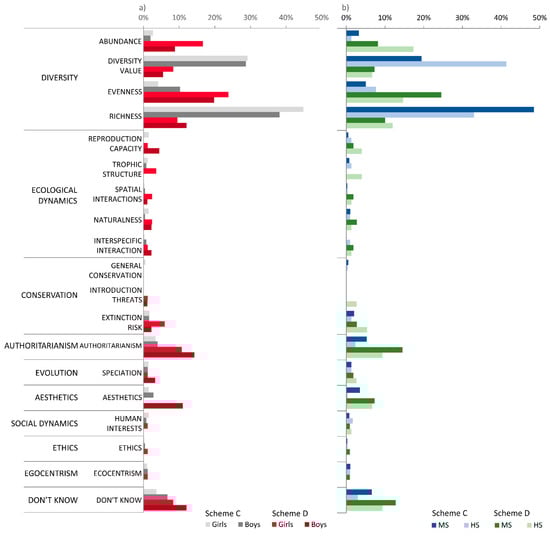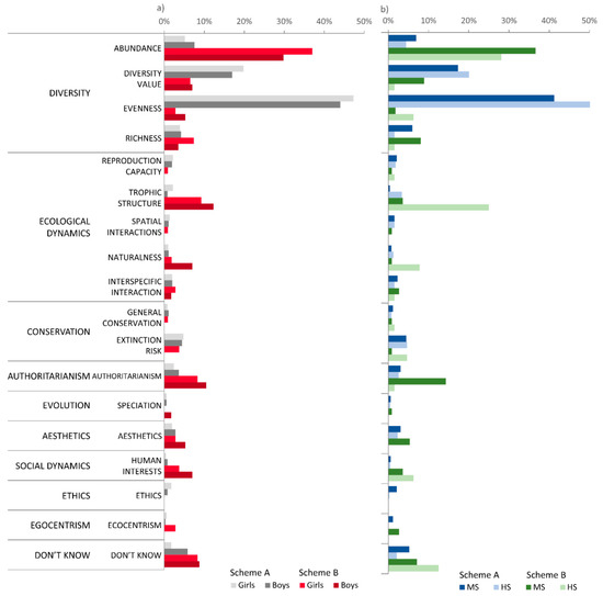 There were no marked differences between the frequencies of subcategories used by girls and boys and those used by MS and HS pupils in association with scheme A, except for Evenness, which was used in greater proportion by HS pupils. Only a small percentage of pupils (11.3%) whose justification included the Evenness argument subcategory provided further reasoning by explaining, for instance, that a more balanced number of individuals among species would: (a) reduce its extinction risk (n = 14); (b) promote greater diversity (n = 12); (c) lead to less antagonistic and/or more beneficial interactions between species (n = 8); (d) promote a balanced food chain (n = 7); or (e) improve species’ reproduction capacity (n = 6).