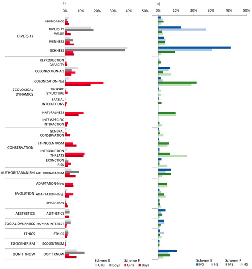 There were no marked differences between the frequencies of subcategories used by girls and boys in relation to both schemes E and F. On the other hand, MS and HS pupils showed greater differences in the use of argument subcategories when justifying both schemes. MS pupils used Richness more frequently than HS pupils to justify scheme E selection, while the latter used the Diversity Value argument more often than MS pupils. The Species Introduction Threat subcategory was used more often by HS pupils. The Extinction Risk argument subcategory was employed more by HS than MS pupils when justifying scheme F. The subcategory “Ethnocentrism” was expressed only in this scenario, and mostly in connection with scheme F.