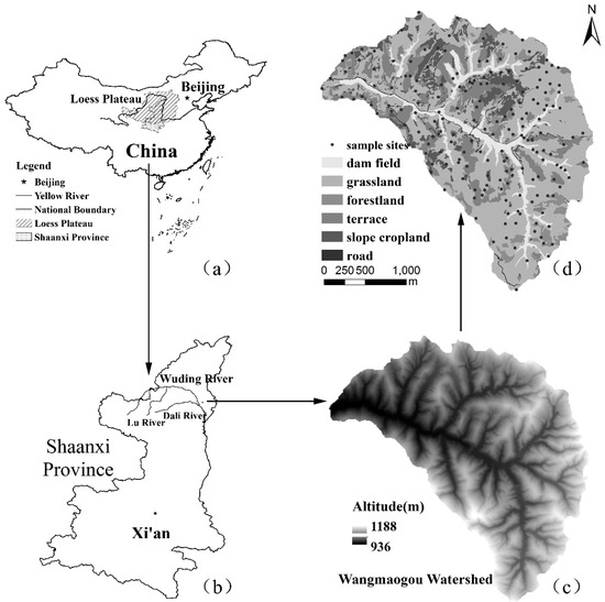 Location map of the Loess Plateau in China (a), Location map of Wuding River in Shaanxi Province (b), The Digital Elevation Model of the Wangmaogou watershed (c), Land use types (d), The sampling point distribution (d) (The direction of the arrow is the layout of the study area from large to small in China).