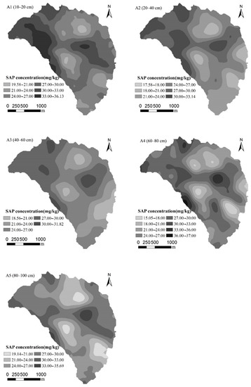 There are prominent differences in SAP at different soil depths and under various land uses. The average contents of SAP under five soil layers of A1, A2, A3, A4, and A5 are 28.19 mg/kg, 27.26 mg/kg, 28.40 mg/kg, 27.66 mg/kg, and 29.37 mg/kg, and the spatial variability of SAP under the five soil layers is moderate. The average SAP content in the five land types in descending order is as follows: grassland > terrace > check dam > sloping cropland > forestland. The SAP content in terrace and dam of layer A1 are significantly higher than that of other land uses. In summary, converting the sloping cropland to grassland, terrace, or dam can raise SAP content.