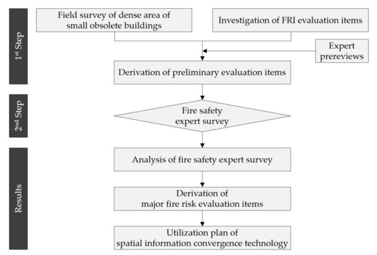 In the first step of this study, preliminary FRI evaluation items specifically tailored to dense areas of small obsolete buildings were derived through a field survey of a dense area of small obsolete buildings, the investigation of FRI evaluation items from existing works, and expert pre-reviews. In the second step, a survey of evaluation items was conducted with fire safety experts that included fire officers, university professors, researchers, industry experts, and fire insurance practitioners. Then, the specific FRI evaluation items for dense areas of small obsolete buildings were derived, and a plan to utilize spatial information convergence technology was reviewed. Figure 1 shows the overall flow of this study.