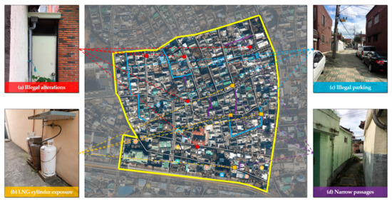 In the area around the survey site, there were 386 densely populated old residential buildings and neighborhood facilities, illegal alterations using sandwich panels that are vulnerable to fire, exposure of liquefied natural gas (LNG) cylinders with the risk of explosion, illegal parking, and narrow passages that could serve as obstacles to firefighting activities. In addition, outdoor fire extinguishers were placed at various locations in passages in case they were not provided inside each building. The status of the field survey site for the deteriorated building district in this study is shown in Figure 2.