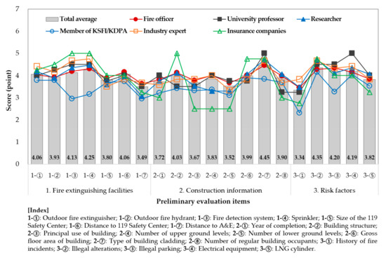 The results of the average score for the preliminary FRI evaluation items according to the fire safety expert survey are presented in Table 8 and Figure 4. Fire officers assigned high scores to the status of sprinkler installation, distance from a 119 Safety Center, and improvement in illegal parking. It is considered that this result is based on the desire to prevent further spread, which can result in large-scale fires by means of initial fire suppression using fire extinguishing facilities, and then securing prompt access for fire services. Other opinions have emphasized the importance of the appointment of a safety manager and regular inspection of fire safety management facilities. University professors specializing in firefighting and disaster prevention emphasized the dangers of outdated electrical equipment, illegal alterations, sprinklers, and illegal parking. It is considered that this result was because aged electrical equipment may increase the risk of fire, and illegal alterations may cause large-scale suffocation incidents in the event of a fire. Researchers from firefighting research institutes, members of the KFSI/KDPA, industry experts in charge of designing fire extinguishing facilities, and staff from fire insurance companies also pointed out similar items as described by the fire officers and university professors as the main evaluation items.