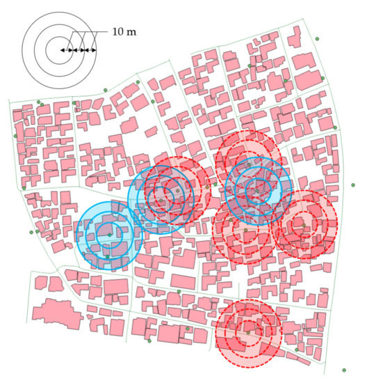 As a result, among the major evaluation items, outdoor fire extinguishers and outdoor fire hydrants (fire extinguishing facilities) as well as electrical equipment and LNG cylinders (risk factors) could utilize a digital map to determine the status of the location of an old building within an effective radius with reference to the GIS coordinates for each facility, as shown in Figure 5. The travel time required from a 119 Safety Center or A&E (fire extinguishing facilities) to an old building was estimated using the minimum distance calculation based on the location of each facility, as shown in Figure 6.