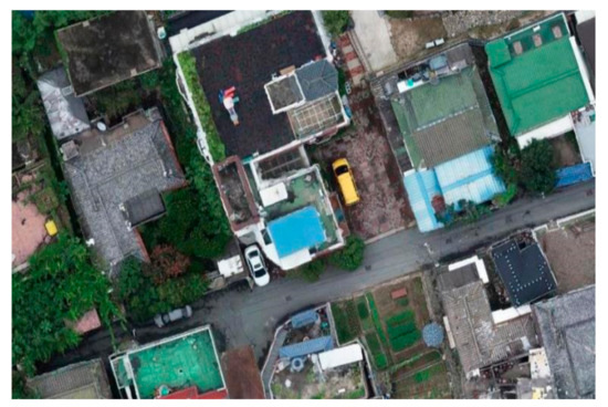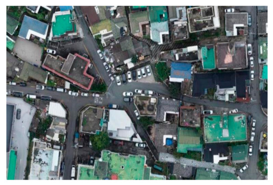 It was also found that drone and ortho-image technologies could be utilized for illegal alterations, illegal parking, electrical equipment, and LNG cylinders (risk factors) as well as the type of building cladding (construction information). In particular, it was possible to obtain time-series information of illegal alterations on the rooftop and illegal parking in the fire engine access road during the day, night, weekdays, and weekends based on aerial photography using drones and aerial ortho-images obtained through post-processing. Cross-validation using digital elevation model data was employed to improve the reading accuracy if the images were difficult to read. The analytical results based on the aerial ortho-images for illegal alterations and illegal parking are shown in Figure 7 and Figure 8, respectively.