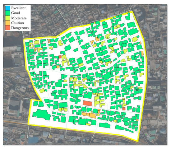 Figure 9 shows an example of the evaluation results of a FRI evaluation platform for dense areas of small obsolete buildings being developed across this whole study. As shown in Figure 9, if the fire risk level of dense areas of small obsolete buildings can be quickly and easily identified by building, it is possible to intensively manage buildings with high fire risk rather than conducting a complete investigation targeting all obsolete buildings. Moreover, it is possible to conduct detailed fire safety inspections of these buildings and expect to reduce the risk of fire effectively.