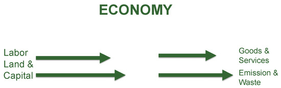 Circular economy concepts are a fundamental departure from the linear resource transformation concept of standard economics. Standard economics views the economic process as a transformation of inputs into outputs of useful goods and services accompanied by an unfortunate by-product of emission and waste. The value of the ‘goods’ produced is positive and not directly influenced by the emission and waste by-product ‘bads’ that invariably accompany the output generation process. Only when the ‘bads’ are explicitly captured in the valuation process as internalized externalities, for example, do they enter the economic valuation framework [13]. This is not an automatic process, and the costs of the negative externalities are not automatically assigned to the economic activities that generate them. They are instead displaced across space and time. This implies that those who benefits from the economic ‘goods’ that generate economic ‘bads’ as by-products do not bear their costs. Their costs are instead born by those unfortunate enough to be exposed to them. Cities are concentrated microcosms of these pitfalls of a linear economy model. Globally, cities consume 75 percent of all natural resources, produce 50 percent of global waste, and generate 75 percent of global greenhouse gases [14]. Figure 1 and Figure 2 illustrate the differing world views of a linear conversion-based versus a circular context-based view of the economy.
