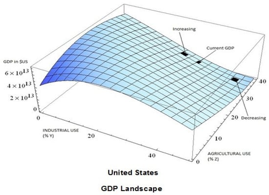 Our modeling approach is not commonly taken in economics. As discussed in the methodological section of this paper, we formulate the allocation of distributed energy for household, industrial, and agricultural uses parametrically. Commonly, the relationship between different variables that comprise economic production is captured in a predetermined functional form. Empirical data is then used to determine the best fit associated with the coefficients that describe the predetermined functional form. We take a different approach and calculate the possible GDP values that can be obtained based on the physical parameters determining freshwater availability and freshwater use allocation across our three key economic sectors. In addition, we consider high and low water use levels and the Stephan–Boltzmann Constant (SB), which represents the embodied energy in fresh water [45]. Our model, therefore, considers that freshwater is not uniformly distributed but can range from high to low water use across the three principal areas of household, industrial, and agricultural use. The three uses are captured in the parameters x, representing the percentage of domestic water use, y, the percentage of industrial water use, and z, the percentage of agricultural water use. Equation (4) thus depicts the landscape of GDP possibilities based on physical parameters as follows: