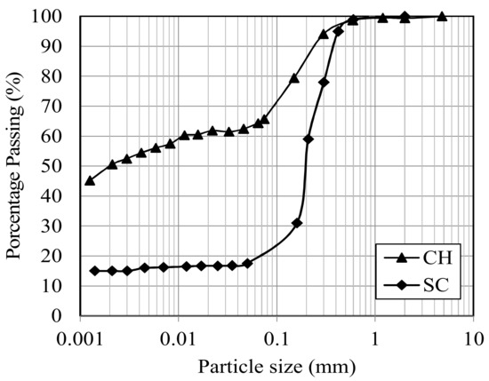 The soil samples were characterized by particle size analysis [44], specific gravity [45], Proctor tests [46], and consistency limits [47]. The physical properties of the soils are presented in Table 1. The particle distribution of the soils is shown in Figure 1.