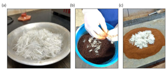 Sample preparation: (a) fibers; (b) mixture with CH soil; (b) mixture with SC soil.