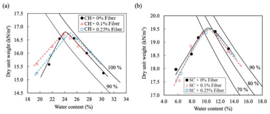 Standard Proctor compaction curves for soil with fiber contents of 0.0%, 0.1%, and 0.25%: (a) CH; (b) SC.