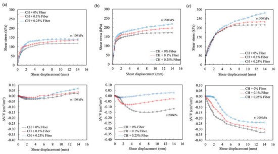 Shear stress and volume change vs. displacement for CH soil with fiber contents of 0.0%, 0.1%, and 0.25%: (a) 100 kPa; (b) 200 kPa; and (c) 300 kPa.