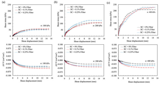 Regarding SC soil (Figure 5), the inclusion of polymeric fibers increased the shear strength of the soil for higher normal stresses and the higher fiber content. The hardening behavior observed for CH soil was not evidenced in SC specimens. Regarding the volumetric change results, a trend of a decrease (contraction) in the volume variation was observed at all stress levels, although the addition of fibers did not produce a trend of a volume increase as in the CH soil. This behavior was also found in the results of Silveira et al. [5], who used polyethylene strips in SC lateritic soil. Maher and Gray [60] and Consoli et al. [61] state that the effect of the inclusion of fibers on the dilation and volume change is more pronounced at higher loads and strain levels. Regarding the initial tangent stiffness of the shear stress–displacement curves, the inclusion of polymeric fibers in both CH and SC soils practically did not affect this property.