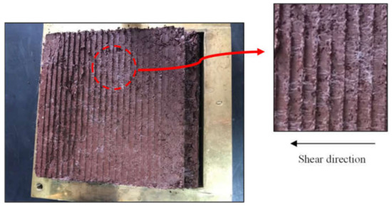 Figure 6 presents the soil–fiber specimens after shear tests, showing the fibers’ orientation at the sheared interface in the CH soil. No deformation or breakage of fibers was observed. Kumar and Singh [62] state that an improvement in the ductility of soil through the stretching of the fibers causes an increase in the soil’s cohesion. According to Darvishi and Erken [51], because of the extensible nature of the fibers, they are stretched in the soil matrix during the shearing process, increasing the tension strength of fiber-reinforced soils. Kong et al. [34] state that the extension of fibers due to rearrangement and microstructure disturbances during shearing provides an important contribution to the increase in strength. For Anagnostopoulos et al. [15], this is a confirmation that fibers withstand tension within the soil matrix without significantly deforming.