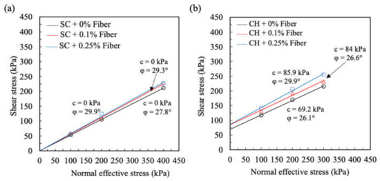 The shear strength envelopes for mixtures with 0%, 0.1%, and 0.25% fiber contents are shown in Figure 7. The failure criterion adopted was the value of peak shear strength. The results shown in Figure 7 evidence the friction behavior of SC soil and the high cohesion (69.2 kPa) and friction angle (26.1°) of the lateritic clayey soil. Indeed, compacted tropical soils exhibit good shear strength behavior when unsaturated [63]. After the inclusion of fibers, an increase in the cohesion and the friction angle was observed with increasing fiber content in the CH soil. The results of Tang et al. [6] on clayey soil reinforced with 12-mm-long PP fibers showed that the values of cohesion and friction angles also increased with increasing fiber content.