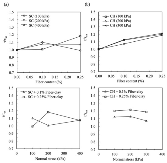 Variation in the shear strength ratio with fiber content and normal stresses: (a) SC; (b) CH.