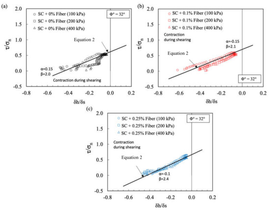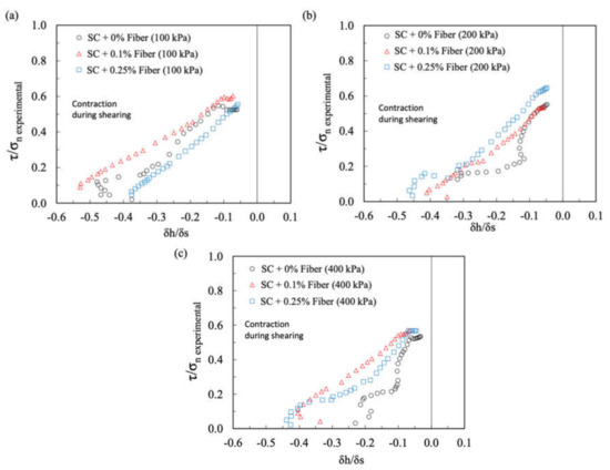 Influence of the inclusion of fibers on the stress–dilatancy relationship under direct shear conditions for SC soil: (a) 100 kPa; (b) 200 kPa; (c) 400 kPa.