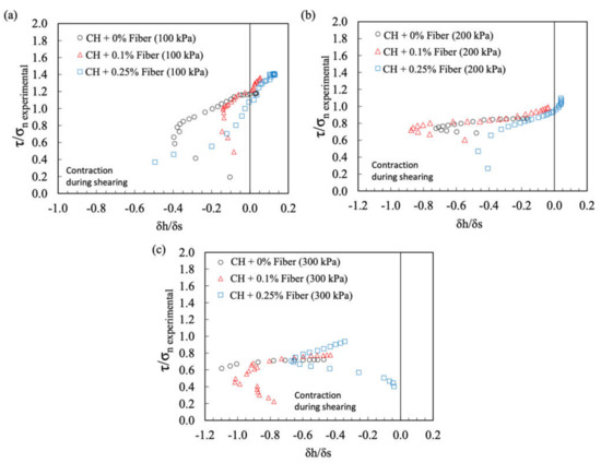 Influence of the inclusion of fibers on the stress–dilatancy behavior under direct shear conditions for CH soil: (a) 100 kPa; (b) 200 kPa; (c) 300 kPa.