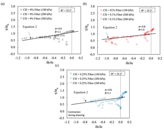 Influence of the inclusion of fibers on the stress–dilatancy relationship under direct shear conditions of CH soil: (a) 100 kPa; (b) 200 kPa; (c) 300 kPa.