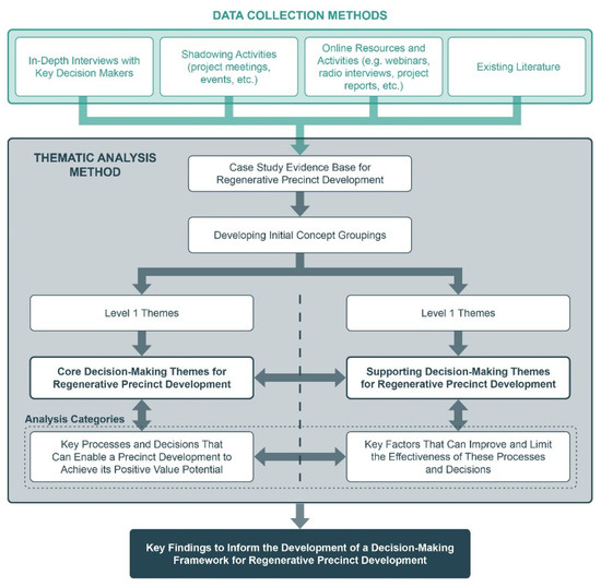 The development of the decision-making framework presented in this paper is primarily built upon the evidence of a qualitative case study investigation into the decision-making approaches of four precincts in Australia that are aligned with regenerative development ideas, processes and aspirations [21]. The qualitative methodological approach of this study is presented in this section across four key areas: (1) the analysis framework used to guide and scope this case study investigation; (2) the data collection and thematic analysis methods used to generate key findings as a set of core and supporting decision-making themes with identified correlations between them; (3) a brief overview of the four case study precincts and how they were identified; and (4) the set of methods, informed by a review of existing regenerative frameworks and tools, that were established to guide how these case study key findings could be structured and represented in the decision-making framework.