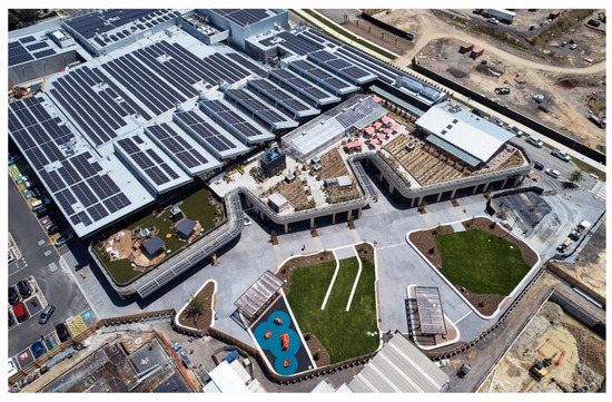 Burwood Brickworks Shopping Centre showing its 1MW solar PV array and rooftop urban farm. Reproduced with permission from Hacer Group.