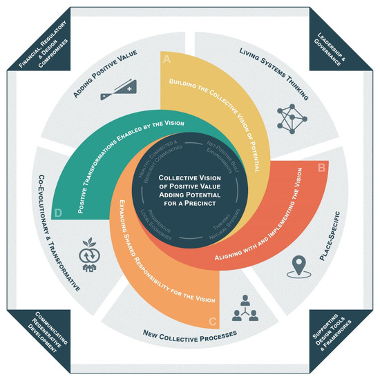 Figure 7 presents the decision-making framework for regenerative precinct development. This primary diagram shows the framework’s overall structure and key elements as well as its theoretical basis. It is a visual representation of (1) the importance of a precinct’s collective vision of positive value adding potential; (2) the five fundamental principles of regenerative development presented in Section 2; (3) the core decision-making themes generated from the case study evidence (Section 4.1); and (4) the supporting decision-making themes generated from the case study evidence (Section 4.2).