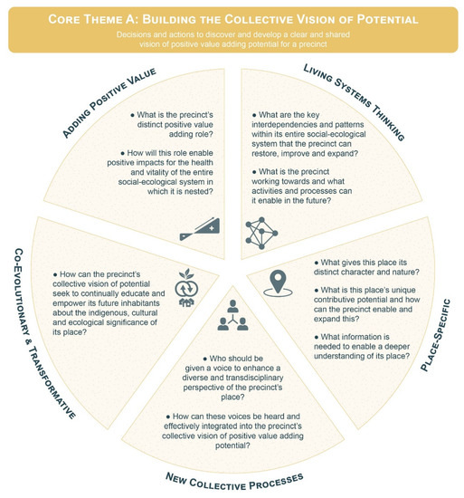 The five fundamental principles of regenerative development defined by Section 2—livings systems thinking, place-specific, new collective processes, co-evolutionary and transformative and adding positive value—form the second key element of the framework. These five principles are visually represented by the outer circle of the framework in Figure 7. Each principle is split into its own wedge within the outer circle to structure the specific guiding questions for each core decision-making theme, which will be discussed below in Section 5.2. Including the five principles in the framework ensures that decision-makers align their thinking, decisions and actions throughout the precinct development process with the fundamental ideas, processes and aspirations of regenerative development, which are defined by these principles.