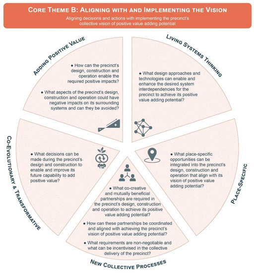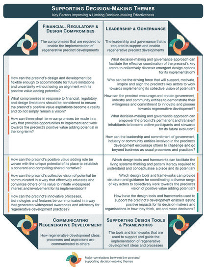 Firstly, under the financial, regulatory and design compromises, the question—how can these short-term compromises be made in a way that provides opportunities to implement and work towards the precinct’s positive value adding potential in the long-term?—seeks to prompt decision-makers to consider how unavoidable compromises to ensure a precinct’s implementation can be reframed from a negative outcome to a positive opportunity for the future. In other words, this question encourages decision-makers to identify the potential benefits of making short-term compromises to enable the implementation of positive value outcomes in the long-term. This guiding question is therefore intended to support decisions made that are primarily made during the design and construction of a precinct and is colour-coded red in Figure 11 to reflect its correlation to core theme B.