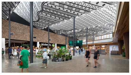 A key example that informed the development of this question from the case study evidence was through the significant cultural and historical learnings that BB’s decision-makers undertook to deepen their understanding of the meaning and importance of its place. Firstly, this was shown through an investigation into the site’s former function as a brickworks. This resulted in not only the naming of the precinct but enabled decision-makers to track down bricks that were made on site in the 1970s and reuse them as part of the shopping centre’s façade. Secondly, this was shown through the awareness, acknowledgement and celebration of the Indigenous history and significance of this place for the Wurundjeri people of the Kulin nation. Opportunities enabled by this then emerged to use the design of the shopping centre to educate visitors about its cultural and historical importance. BB’s expansive ceiling designed by a local Indigenous artist (Figure 10) and the visitor experience upon entering are evidence of how this was achieved—“when you walk in through the lobby you get this soundscape of the forest and the smellscape of burning eucalyptus, which is part of the welcoming for the Wurundjeri people”.