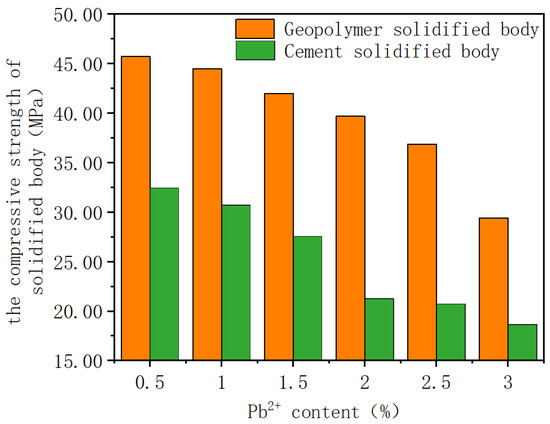 As shown in Figure 1, the compressive strength of the fly ash-based geopolymer solidified body is significantly higher than that of the cement solidified body. It is analyzed that the compressive strengths of both tend to decrease with the increase in Pb2+ content. When Pb2+ concentration is 2%, the compressive strength of the geopolymer solidified body is still around 40 MPa; the strength decreases slowly until the Pb2+ concentration reaches 2%, and more rapidly after this. In contrast, the strength of the cement solidified body decreases at a relatively rapid rate all along. Therefore, the performance of the geopolymer solidified body is significantly better from the point of view of the compressive strength.