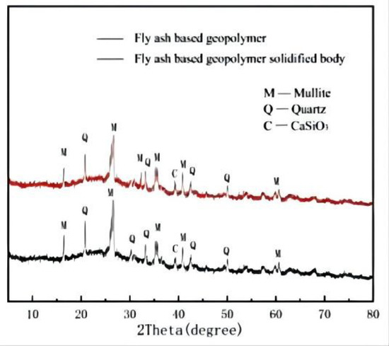 The variations in the mineral phase of the fly ash-based geopolymer and its solidified body are shown in Figure 4. Comparing Figure 4 with Figure 3, the crystalline phases in the fly ash-based geopolymer are mainly mullite and quartz, with a small amount of calcium silicate present at 39.54°, and the crystalline diffraction peaks are somewhat reduced compared to that in the fly ash XRD pattern, demonstrating that the crystalline substances in the fly ash react to form amorphous substances during the alkali excitation process. Additionally, in the curve of the pure fly ash-based geopolymer, “bun”-shaped dispersion peaks appear in the interval 18° to 35 °, which are slightly shifted to the right compared to the fly ash curve, indicating that the dissolution of the vitreous body in the fly ash produces amorphous gel-like substance in the fly ash-based geopolymer; the absence of new phases and the disappearance of old phases mean that some of the crystalline particles in the fly ash are dissolved, and some are encapsulated by the gel material in the geopolymer, which corresponds to the SEM results.