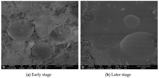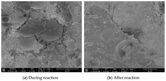 Figure 7a shows the state during the solidifying Pb2+ reaction of the fly ash-based polymer, and the fully reacted state is given in Figure 7b. Compared to Figure 7a, a more complete and dense whole is formed in the latter figure, resulting in a good performing solidified body of the fly ash-based geopolymer.