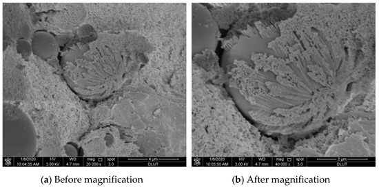 Figure 6 shows the electron micrographs of the fly ash-based geopolymer during the reaction. Compared to the early stage of the reaction in Figure 5a, the wrapping condition in Figure 6a is more complete, and the progress of the reaction can be clearly observed. Figure 6b is a partial magnification, showing that the gel in the geopolymer slowly grows and extends from the top of the particle downwards until it completely wraps around the geopolymer, forming a kind of core-shell structure. These indicate that a portion of the fly ash particles is encapsulated by the gel into a core-shell structure, except for a portion being dissolved by the alkaline solution. The outer shell of this structure extends until it completely encapsulates the geopolymer and then forms a integral whole with its surrounding dense gel-like substances, which also has a beneficial effect on the mechanical properties of the geopolymer.
