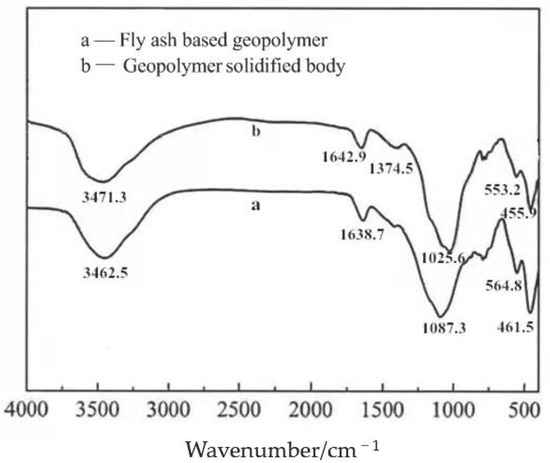 The infrared spectrum of the fly ash-based geopolymer and its solidified body is shown in Figure 8.