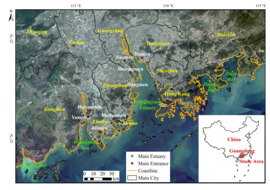 Located in the southern margin of the South China fold belt, GBA has a long geological history and has experienced many tectonic movements, forming marine accumulation and marine erosion landforms. The NE, NW and EW trending tectonic lines are formed. Under the influence of these lines, many fault block structures are formed along the coast and headlands, and bays are interchanged [29]. The landforms on land and underwater are complex, including mountains, hills, terraces, plains amongst other forms. The terrain is mainly plain, accounting for about 70%, and the others are mostly mountains and hills. Zonal soils are mainly lateritic and red soil, developed on sandstone, shale and granite parent material [41]. Bound by PRD, GBA is a composite delta accumulated in the estuary by the sediment brought by the lower reaches of the Xijiang, Beijiang and Dongjiang rivers of the Pearl River system. The tidal flat is rich in resources and emptied into the South China Sea from the east to the west by eight entrances, such as Humen, Jiaomen and Hongqimen. Facing the vast South China Sea, the tide is irregular mixed semidiurnal tide, and the perennial average tidal range is less than 2 m. GBA has a subtropical and tropical monsoon climate, with high temperature and rainy weather all year round. The average annual temperature is 21–23 ℃, and the average annual sunshine hours exceed 2000 h. Most of the rainfall is concentrated in summer and autumn, with an annual rainfall of more than 1500 mm, and frequent rainstorms in summer, often resulting in flooding hazards. Northeasterly wind predominates in autumn and winter, southeast and southwest wind predominates from late spring to summer [26]. Typhoons often have the influence of strong winds, floods and storm surges all year round, which cause heavy casualties and economic losses. In 2020, the coastal sea level of Guangdong Province will fluctuate greatly, which will aggravate the occurrence of storm surge, flooding and other hazards [19].